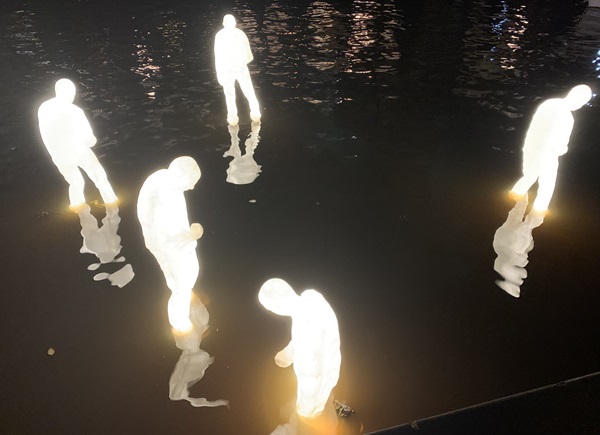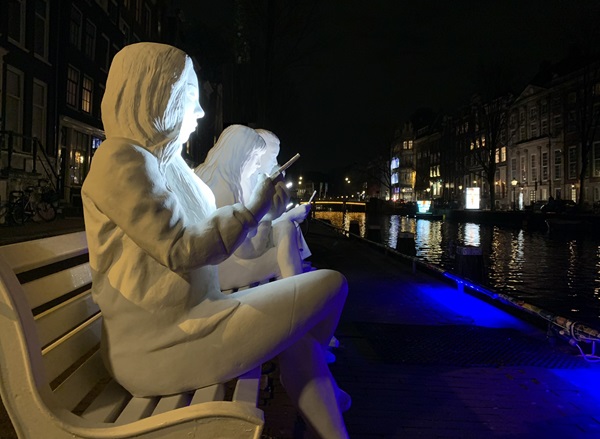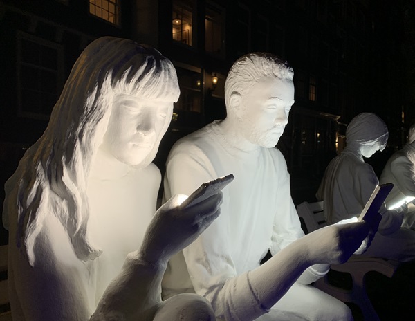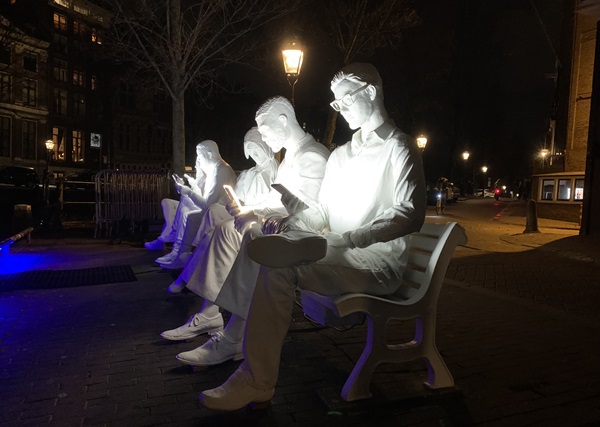 Liam Campbell deed dat heel direct met 'Cell Phone' met een gigantische mobiele telefoon met rekbaar materiaal waaruit een gezicht tevoorschijn komt. Gali May Lucas laat eveneens zien dat we ons vaak meer bezig houden met de virtuele wereld, de oppervlakkige werkelijkheid, dan met elkaar in het 'echte' leven. Dit doet ze met 'Absorbed by Light', drie levensgrote menselijke sculpturen, zittend op een bankje. De 'Artificial Humans' lijken er op, verspreid door de stad staan verschillende 'mannetjes' in en aan de gracht. Allemaal met het hoofd omlaag, starend naar hun schermpje. Artificial Humans is bedacht en gemaakt door Atelier Haute Cuisine.