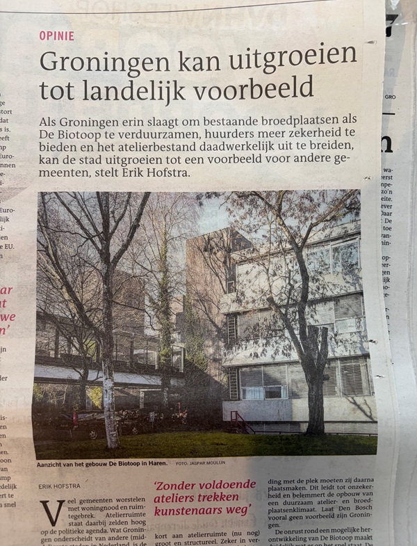De waarde van deze plekken, ateliers en creatieve broedplaatsen, kun je niet alleen maar uitdrukken in cijfers of euro-tekens. De meerwaarde van kunst en cultuur is zoveel meer dan dat. Voor de creatieve beroepsgroep zelf, maar ook voor omwonenden. Zoals hobbyisten, jongeren en kinderen die les krijgen van professionele kunstenaars. Zonder voldoende ateliers en broedplaatsen trekken kunstenaars weg en verschraald het lokale kunstklimaat en culturele aanbod. Gelukkig ziet het er, wat betreft De Biotoop, steeds meer naar uit dat Groningen een pad inslaat die wezenlijk afwijkt van die in veel andere (middel)grote steden, waar tijdelijkheid en sloop maar al te vaak gezien worden als vanzelfsprekend.